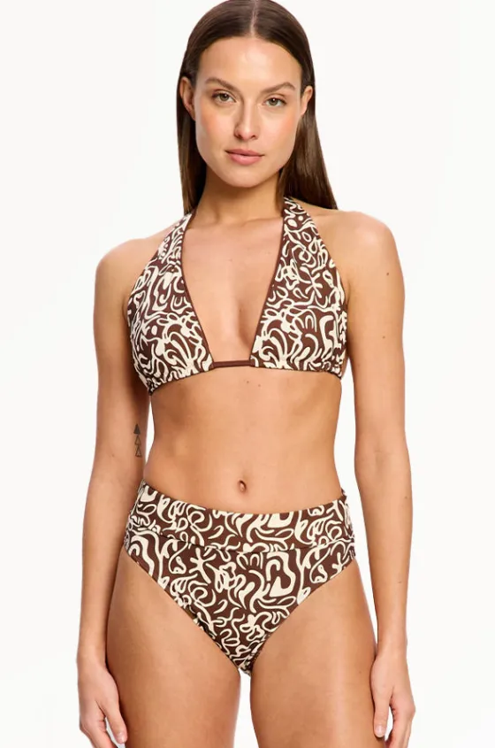 Modibodi Sea Swirl Reversible Multiway Top Set in Chocolate features a triangle shape, high waist pant, period protection, and is available in sizes 8-14.