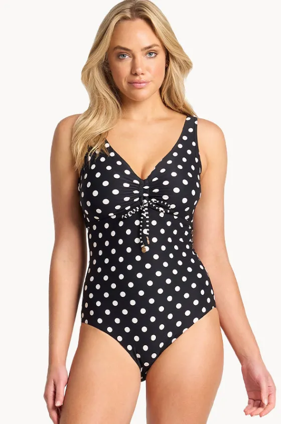 Sunseeker Seoul F/G Cup Tie One Piece in Black offers a seamless neckline with centre front tie, underwire, front powermesh, is best suited to F-G cup sizes.