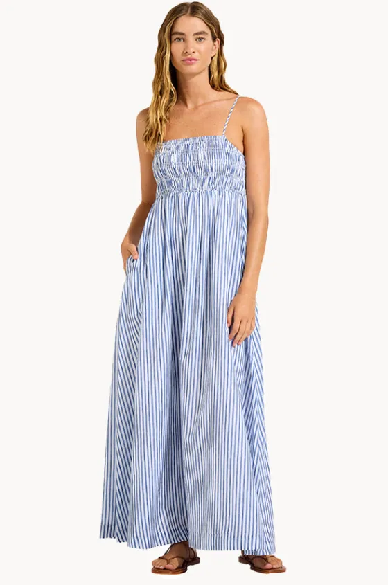 Seafolly Shirred Midi Dress in Marine features a shirred bodice, adjustable straps, relaxed fit, inseam side pockets, and is available in sizes S-L.