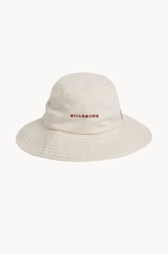 Billabong Society Hat in Salt Crystal features a bucket design, embroidered eyelets, chin strap with toggle, and is available in sizes S-L.
