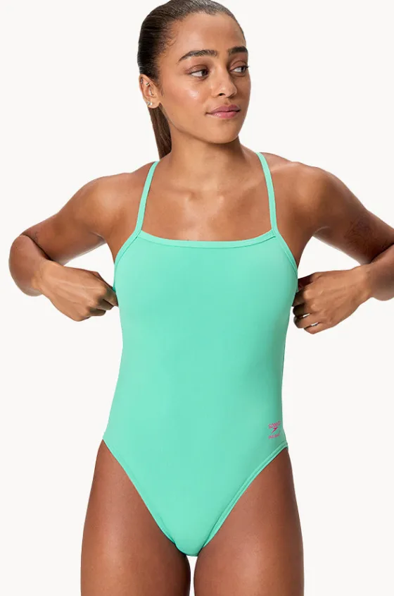 Speedo Solid V-Back 2.0 One Piece in Aqua features a round neckline, low open back, raised legline, chlorine resistant, and is best suited to A-C cup sizes.