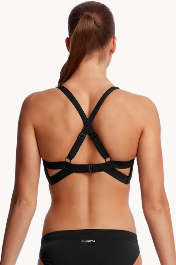 The Funkita Still Black Hold Steady Crop Top in Black, features a supportive underwire, cross back straps, removable cups, and designed for cup sizes DD-E.