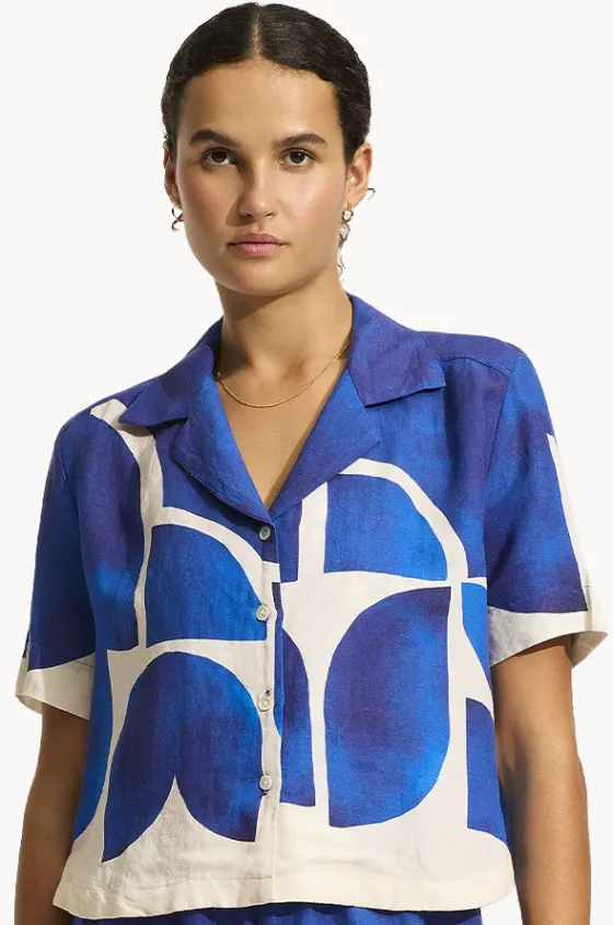 Seafolly Sunray Cropped Shirt in Marine features a collared neckline, short sleeves, button up front, relaxed fit, and has a cropped length.