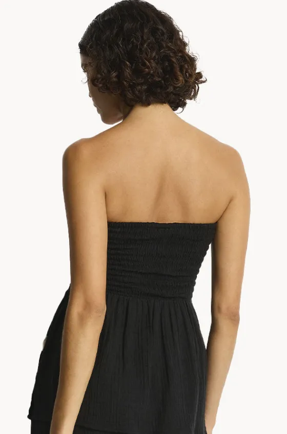 Sea Level Sunset Shirred Bandeau Top in Black features a shirred bodice, soft touch fabric, side splits, generous body length, and is available in sizes XS-L.