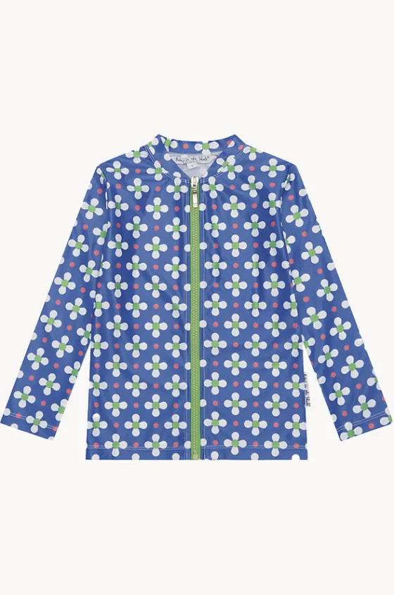 Babes In The Shade Teen Girls Clover Suntop in Blue/White offers UPF 50+ sun protection, long sleeves, front zip, chlorine resistant, available in sizes 8-14.