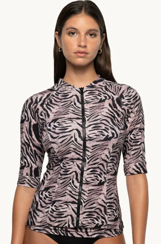Nip Tuck Tuamotu Yvonne Suntop in Animal features a high neckline, front zipper, UPF 50+ sun protection rating, mid length sleeves, is available in sizes 8-16.