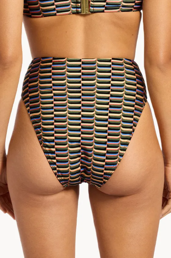 Jets Urban Geo High Waist High Leg Pant in Cacti features a high rise waist, raised legline, low-medium coverage, sustainable, and is available in sizes 8-14.
