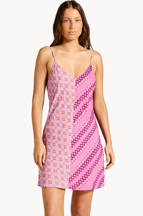Tigerlily Utopia Kassia Mini Dress in Orchid features a V-shaped neckline, adjustable straps, contrast panelling, mini length, and is available in sizes 8-14.