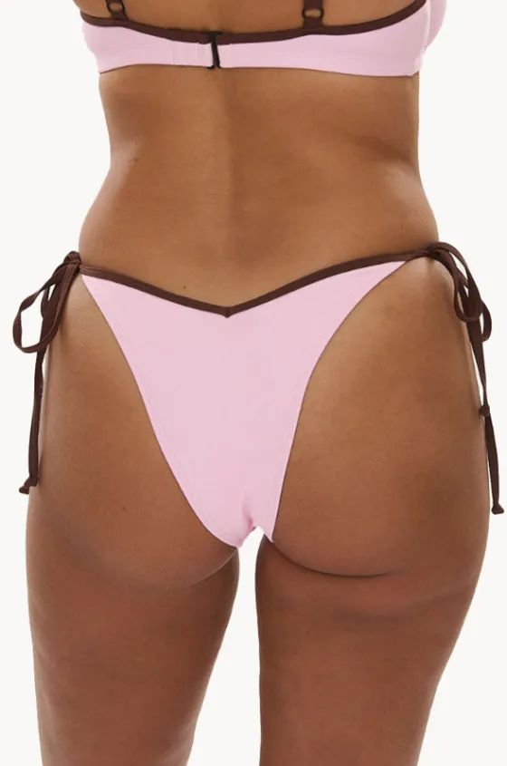 RAQ Bind Cheeky Tie Side Pant in Floss/Choc features a high cut leg, cheeky coverage, contrast binding, adjustable tie sides, and is available in sizes 8-12.