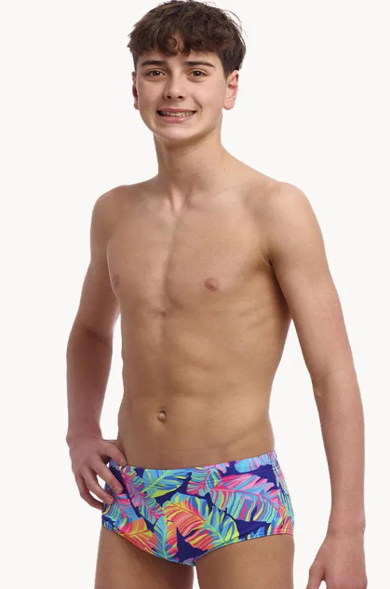 Funky Trunks Boys Leaving Today Trunk in Navy/Multi features an elasticated waistband, drawcord, front lined panel for modesty, and is chlorine resistant.