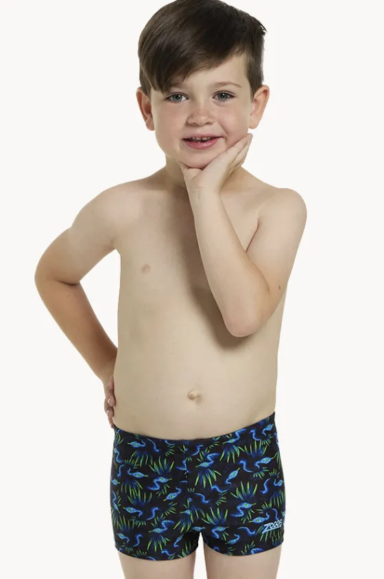 Zoggs Boys Reptile Hip Racer Trunk in Black/Blue features an internal drawcord, 17cm leg length, quick drying, sustainable, and is available in sizes 3-6.