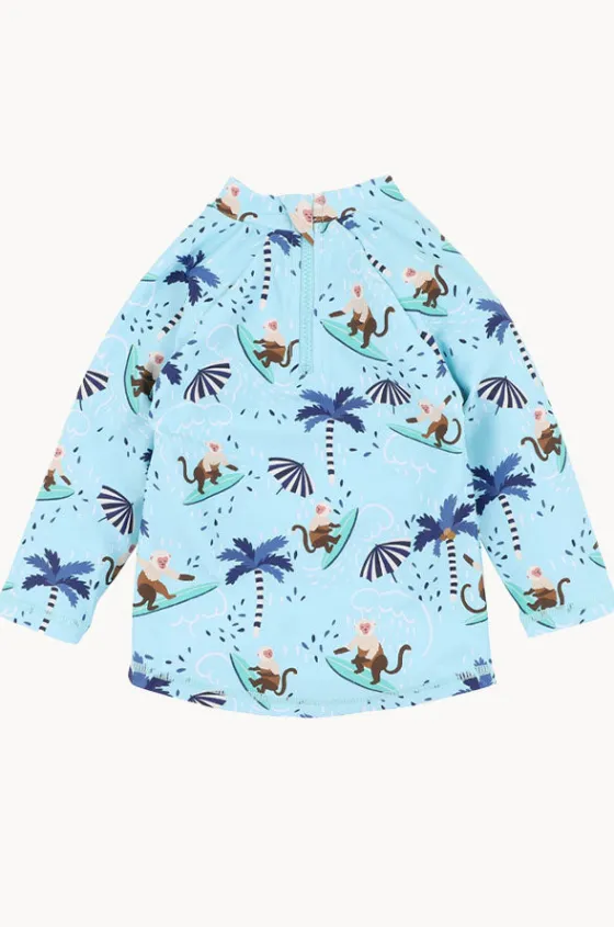 Minihaha Boys Riley Suntop in Light Blue offers a crew neckline, sun protection, long sleeves, back zipper, sustainable thread, and is available in sizes 1-2