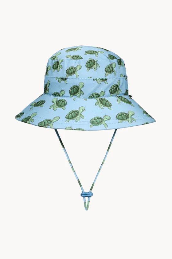 Bedhead Boys Sheldon Classic Bucket Sunhat in Light Blue offers a anti-flop brim, chin strap with toggle, has a UPF rating of 50+, is a water-friendly style.