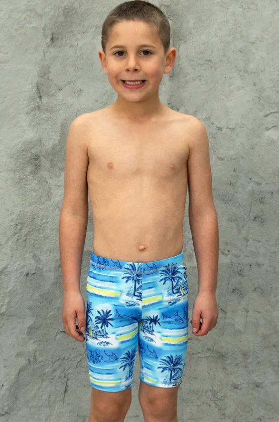 Salty Ink Boys Shipwrecked Jammer in Ocean features an internal drawcord at waist, knee length, fully lined, and is available in sizes 4-8.