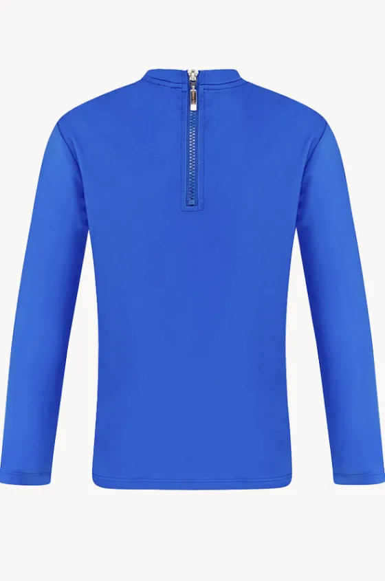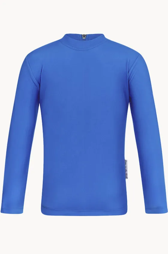 Babes In The Shade Boys Suntop in Sky offers a round neckline, sun protection, long sleeves, back zip, chlorine resistant thread, and is available in sizes 4-7.