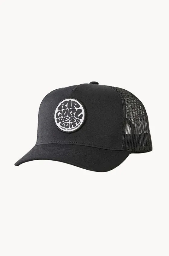Rip Curl Boys Wetsuit Icon Trucker Cap in Black features a curved peak, mesh panelling, adjustable snap back closure, and is available in O/S.