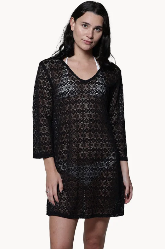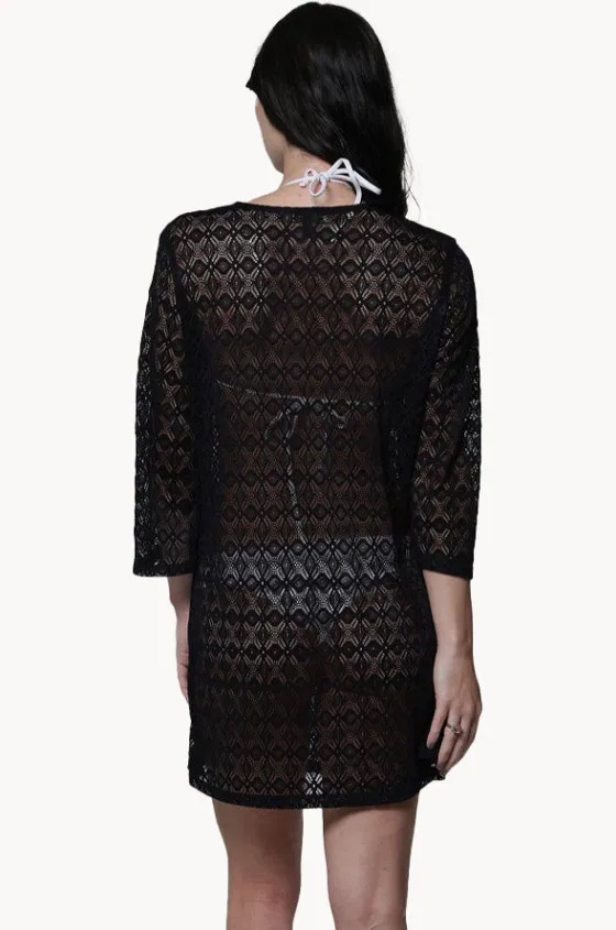 J’Valdi Diamante V Neck Tunic in Black features a V-shaped neckline, 3/4 length sleeves, above knee length, relaxed fit, and is available in sizes S-XL.