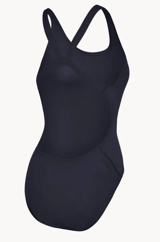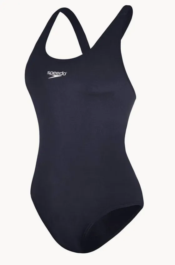 Speedo Endurance+ Leaderback One Piece in Navy features fixed straps, chlorine resistant thread, suitable for A-C cup sizes, available in sizes 8-22.