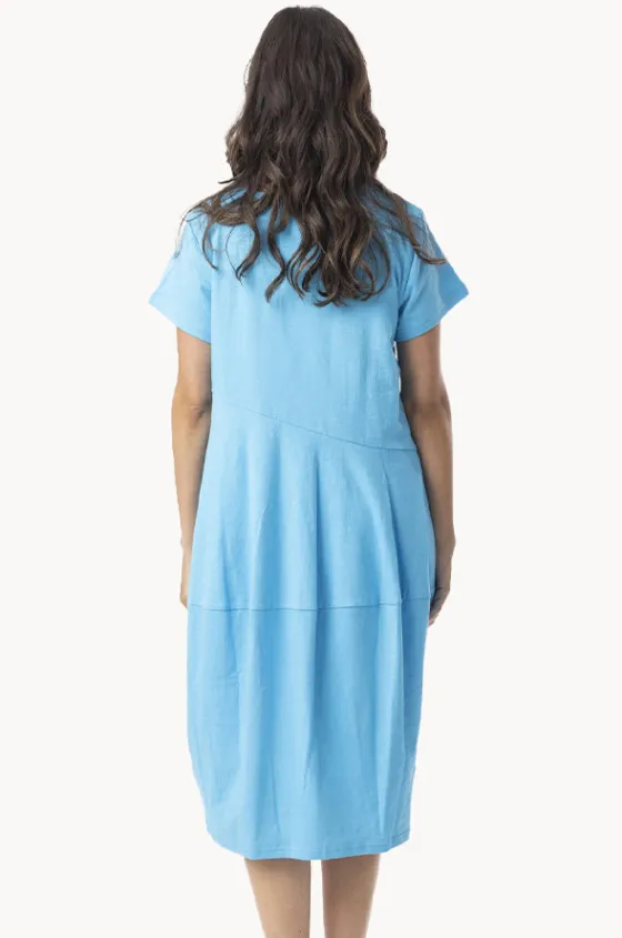 Orientique Essentials Knit Bubble Dress in Turquoise features a round neckline, short length, inseam side pockets, knee length, and is available in sizes 10-18.