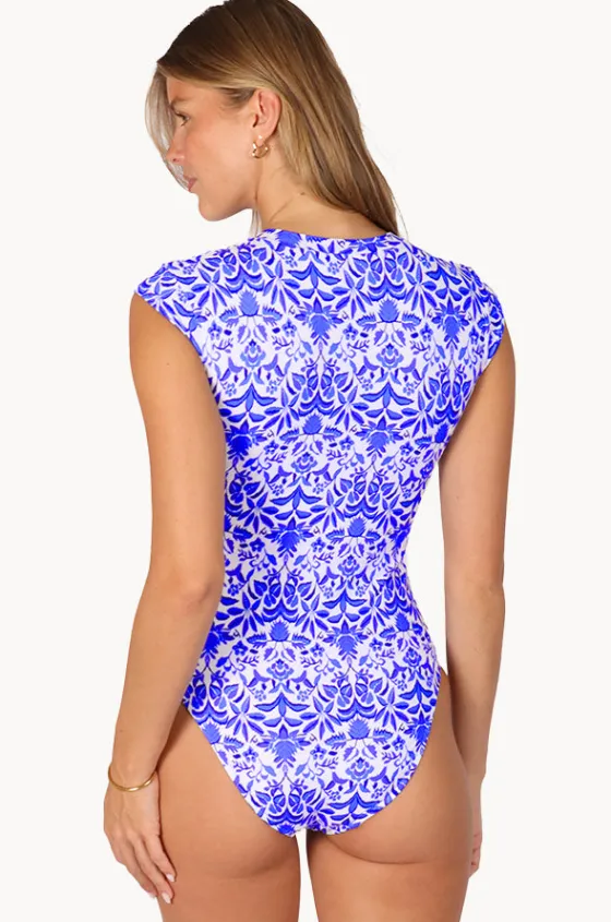 Baku Free Spirit Zip Front Sunsuit in White features a round neckline, cap sleeves, sun protection rating, front zip, and is best suited to A-D cup sizes.