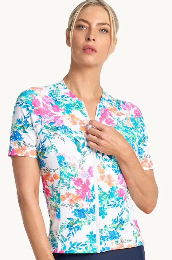Jantzen Fresia Short Sleeve Suntop in White features front zipper, short sleeves, mastectomy pockets, soft cups, and is best suited to A-C cup sizes.