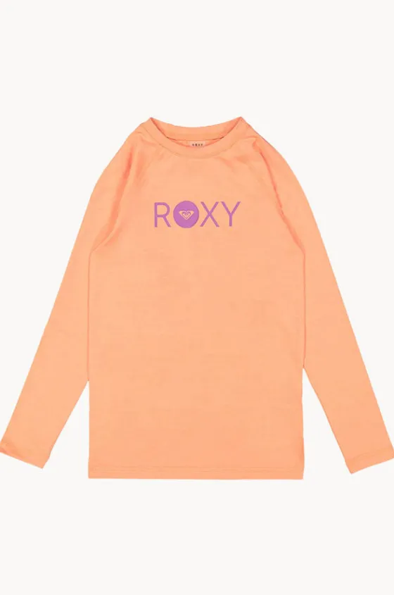 Roxy Girls Essential Long Sleeve Suntop in Coral features a round neckline, long sleeves, sun protection, sustainable fabric, and is available in sizes 8-16.
