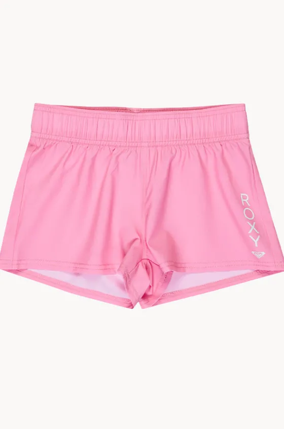 Roxy Girls Essentials Boardshort in Bonbon features a mid rise waist, elasticated waistband, 4-way stretch, sustainable fabric, and is available in sizes 8-16.