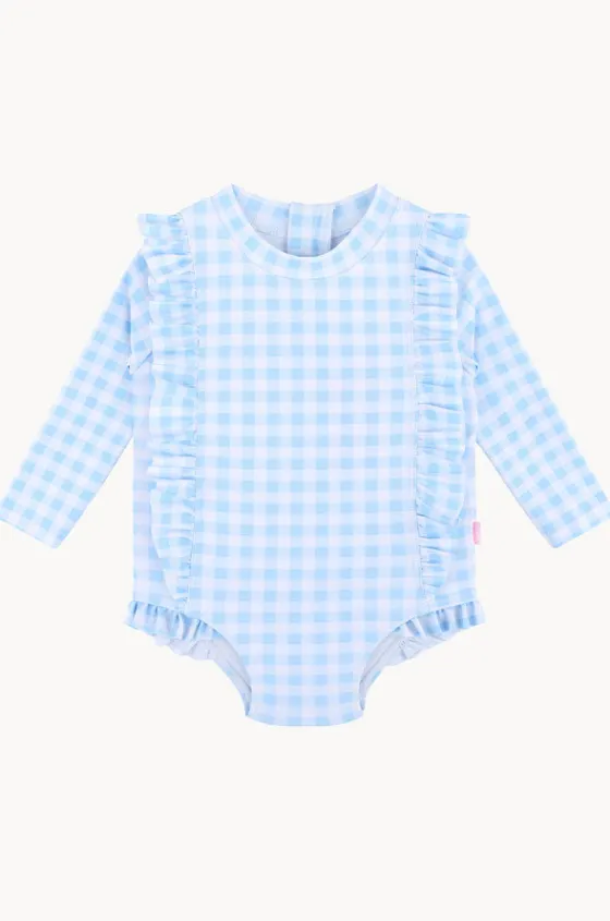 Seafolly Girls Gingham Frill Sunsuit in Blue features a round neckline, back zipper, long sleeves, UPF 50+ sun protection rating, and is fully lined.