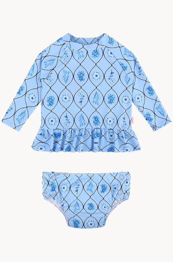 Seafolly Girls Marbella Suntop Set in Blue features a round neckline, long sleeves, peplum, coordinating swim nappy, and has a UPF 50+ sun protection rating.