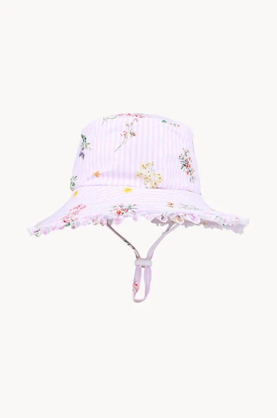 Minihaha Girls Myra Swim Hat in Pink/Multi features a bucket hat, wide brim with ruffle edge, chin strap, back toggle, and is available in sizes S-XL.