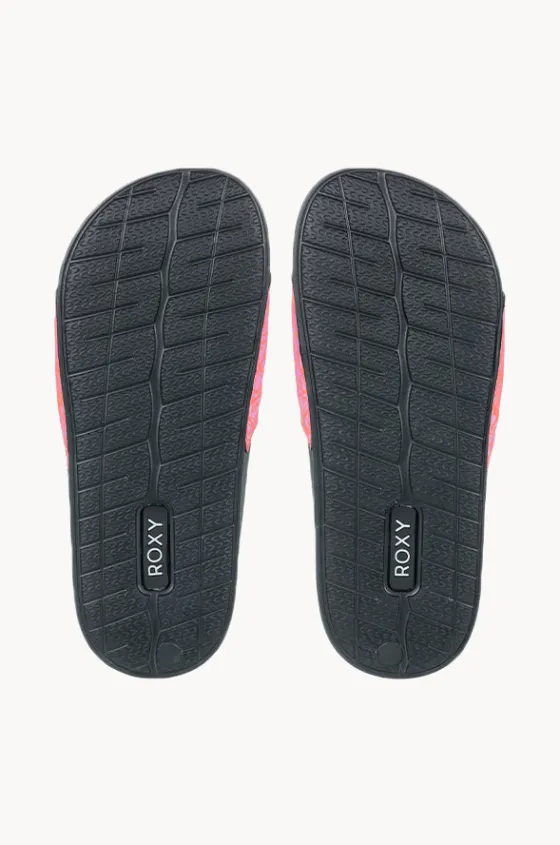 Roxy Girls Slippy II Slide in Black/Red features a slide on design, embossed Roxy lettering, moulded footbed, and has a durable rubber outsole.