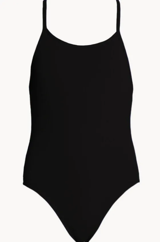 The Funkita Girls Still Black Diamond Back One Piece in Black offers single bind straps, quick drying and chlorine resistant, available in sizes 8-14.