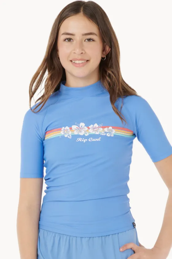 Rip Curl Girls Surf Revival Suntop in Blue features a standard fit, vintage design, short sleeves, UPF 50+ sun protection, and is available in sizes 8-14.