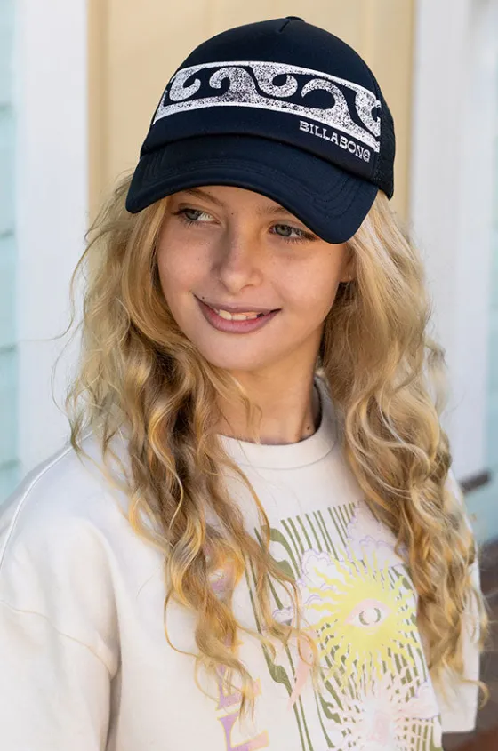 Billabong Girls Wave Fade Trucker Cap in Off Black features a curved peak, breathable mesh panelling, adjustable back, and is available in O/S.