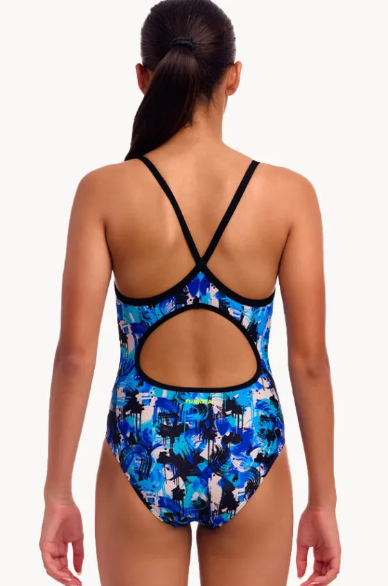 Funkita Girls You Messer Diamond Back One Piece in Blue/Black offers single bind shoulder straps, quick drying, chlorine resistant, available in sizes 8-14.