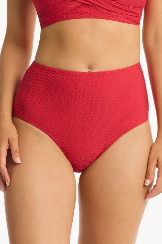 The Sea Level Honeycomb High Waist Pant in Red features a high rise fit, supportive waistband, powermesh, medium coverage, designed for sizes 8-18.