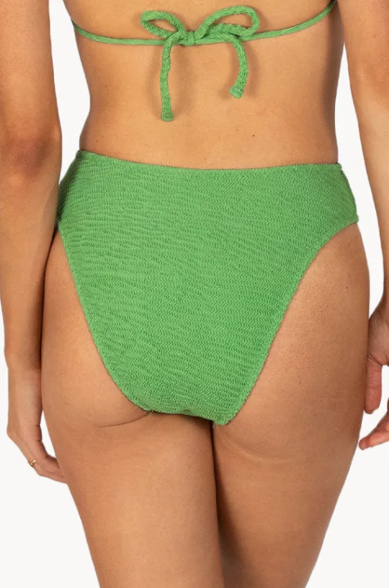 Baku Ibiza High Leg Pant in Moss offers a mid-high rise waist, raised legline, cheeky coverage, textured fabric, fully lined, and is available in sizes 8-14.