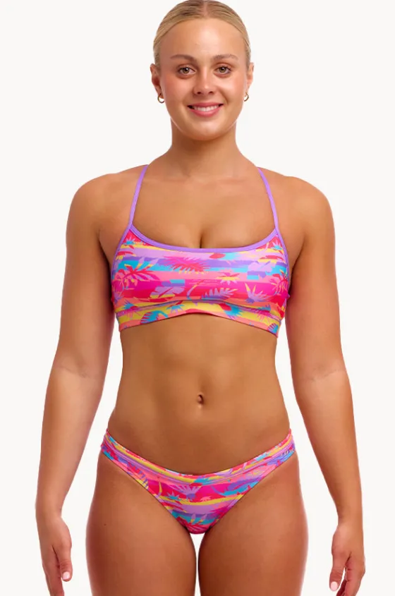 Funkita Leave In Crop Set in Pink/Purple features double bind straps, hipster pant with drawcord, chlorine resistant, and is best suited to A-C cup sizes.