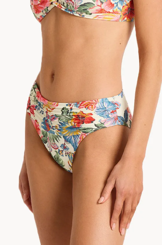 Monte & Lou Marisol Mid Rise Ruched Pant in White/Multi features a mid rise waist, front ruching, medium coverage, and is made from sustainable fabric.
