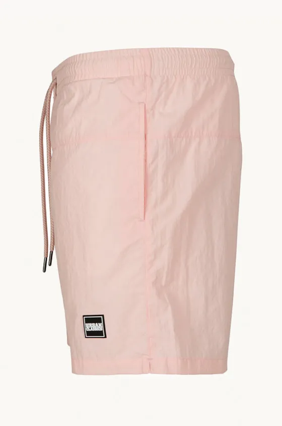 Urban Classics Mens Block Swim Short in Pink features a 5″ inseam, quick-dry nylon, mesh lining, drawstring waist & side pockets.