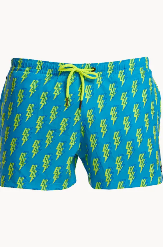 Funky Trunks Mens Bolted Shorty Short in Blue/Yellow features an elasticated waistband, drawcord, deep side pockets, 8.5cm inseam, and is quick drying.