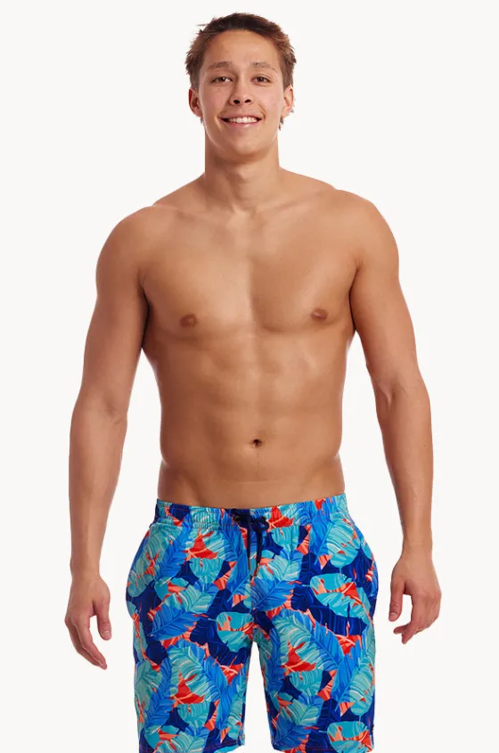 Funky Trunks Mens Lotsa Leaves Long Johnny Short in Blue/Orange features an elasticated waistband, drawcord, deep inseam side pockets, with brass hardware.