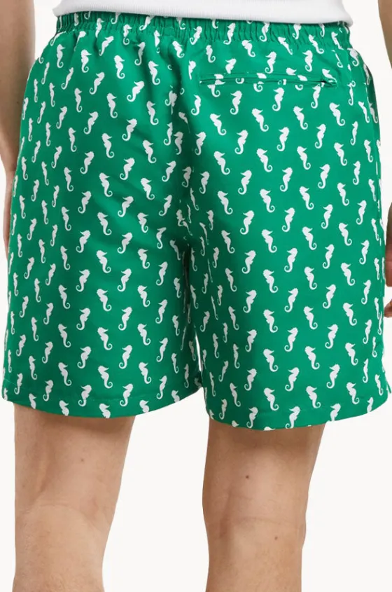 Urban Classics Mens Seahorse Swim Short in Bright Green features a 5″ inseam, quick-dry nylon, mesh lining, drawstring waist & side pockets.