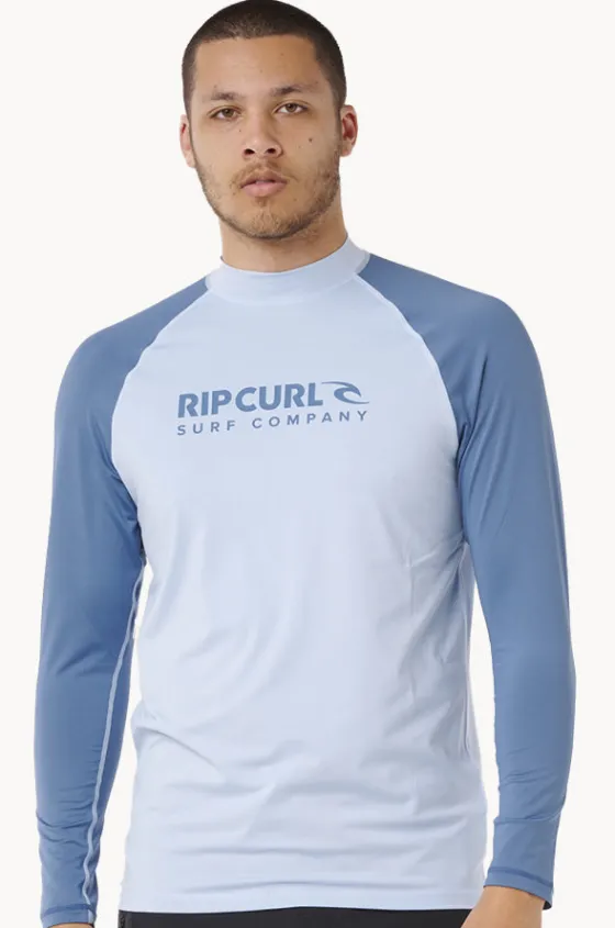 Rip Curl Mens Shock Long Sleeve Suntop in Blue features long sleeves, UPF 50+ sun protection, branding detail on front, and is available in sizes S-XL.