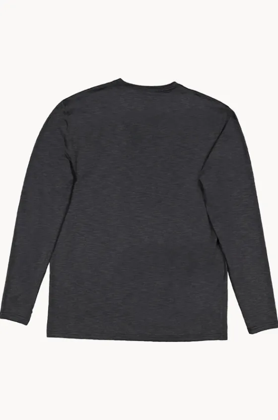 Billabong Mens Shoreline Long Sleeve Suntop in Black features a round neckline, long sleeves, UPF 50+ sun protection rating, and has a loose fit.