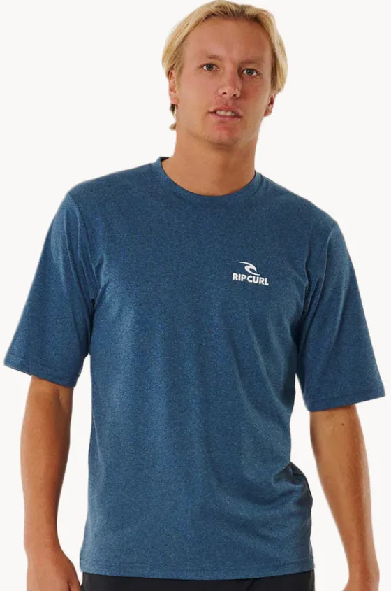 Rip Curl Mens Stack Short Sleeve Suntop in Navy Marle features a round neckline, short sleeves, UPF 50+ sun protection rating, and is available in sizes XS-3XL.