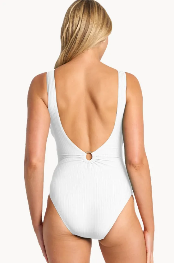 Sunseeker Reset DD/E Cup Vee Ring Back One Piece in White features underwire, shelf bra, low back with ring detail, and is best suited to DD-E cup sizes.