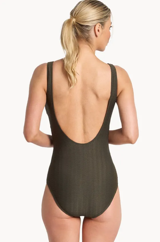 Jantzen Sky High Buckle One Piece in Army features fixed straps, removable cups, front powermesh, regular legline, and is best suited to A-C cup sizes.