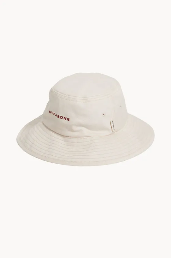 Billabong Society Hat in Salt Crystal features a bucket design, embroidered eyelets, chin strap with toggle, and is available in sizes S-L.