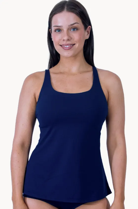 Base Swim Sports Swing Tankini Separate in Navy features an A-Line shape, powermesh, mastectomy-friendly, chlorine resistant, is best suited to A-D cup sizes.